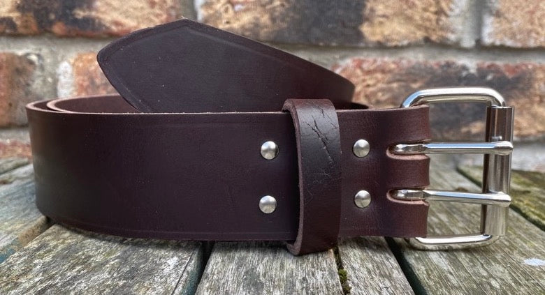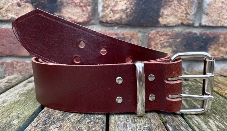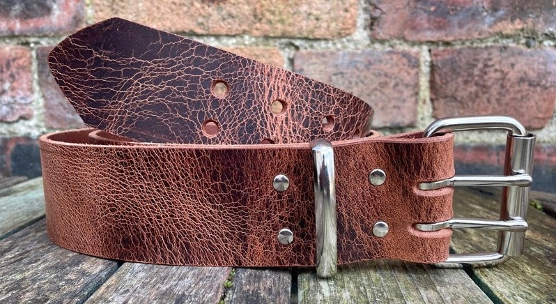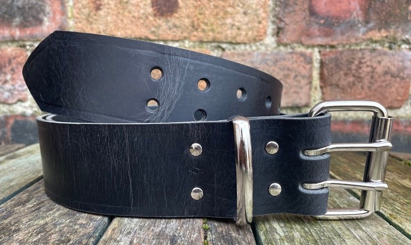 Measuring approx 2 inches (50mm) wide but please note that 2 inch wide belts won’t fit through most trouser loops, fitted with a heavy duty nickel plated steel double prong roller buckle and available with a leather or nickel plated steel keeper loop.