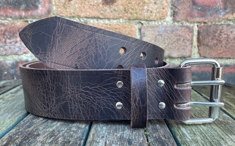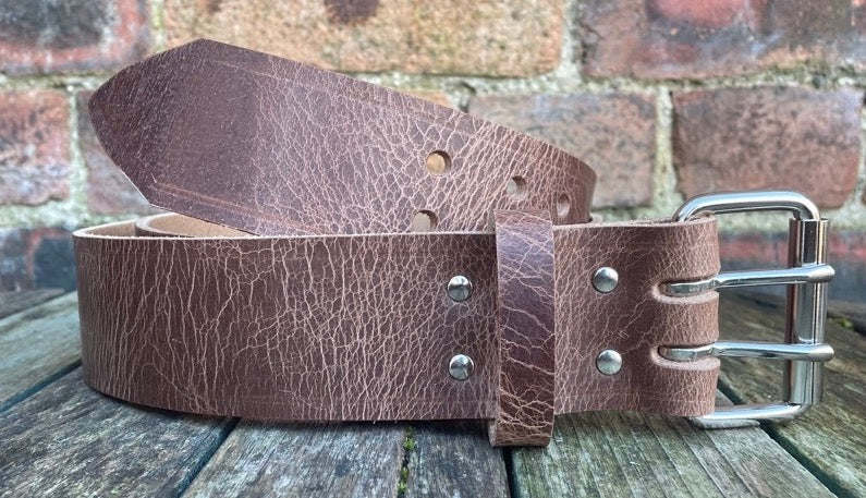 This belt is made from approx 3.5 - 4mm thick heavyweight full grain buffalo leather (80% vegetable tanned and 20% chrome tanned) in plain or a worn distressed look finish, due to the nature of the worn look leather the pattern on the one you received will be slightly different to that shown.