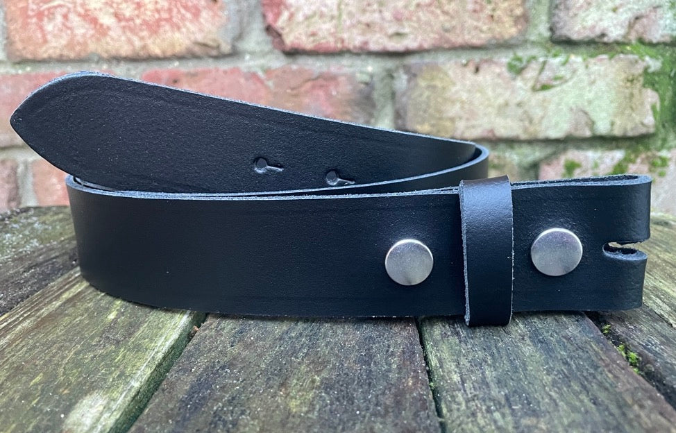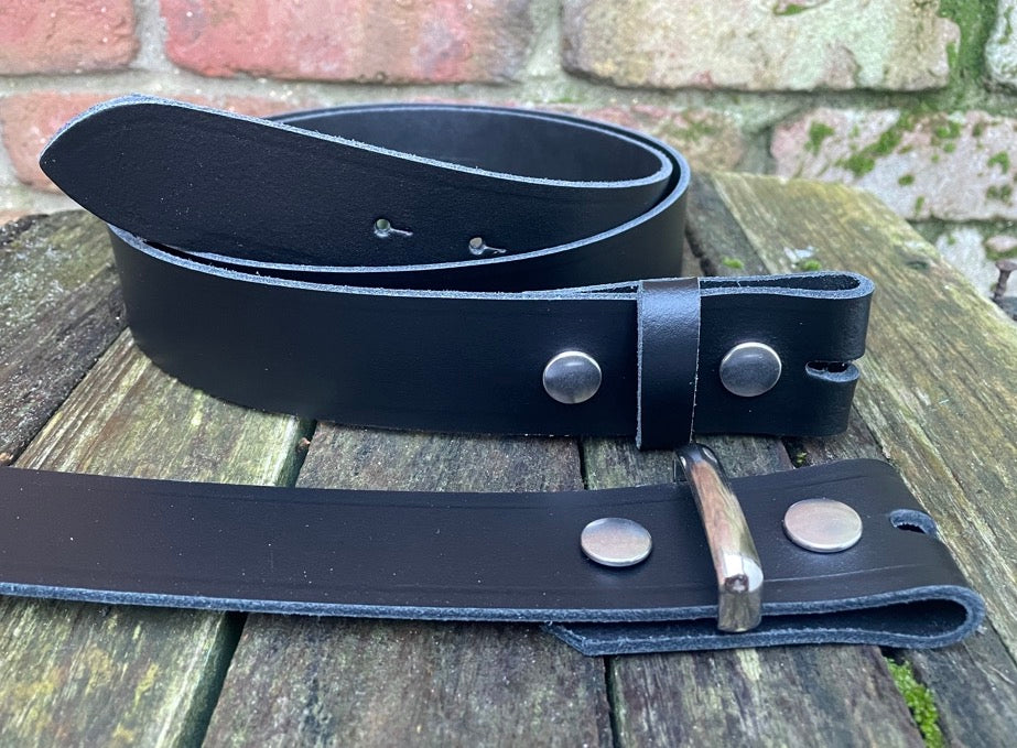 Fitted with nickel plated steel press studs / snaps, either a leather or nickel plated steel keeper loop (I can't get loops in 44mm widths) and available in a choice of 7 widths: