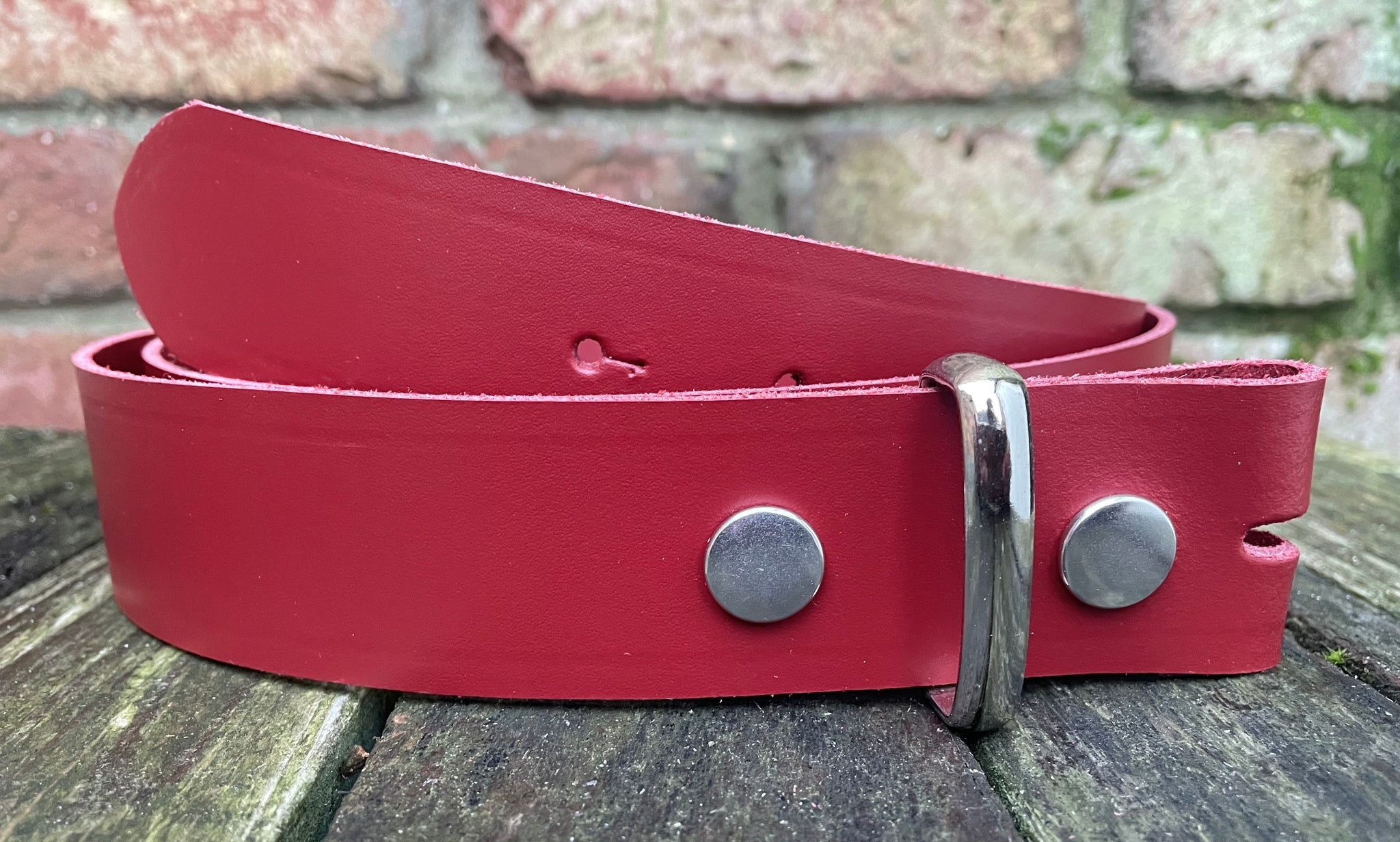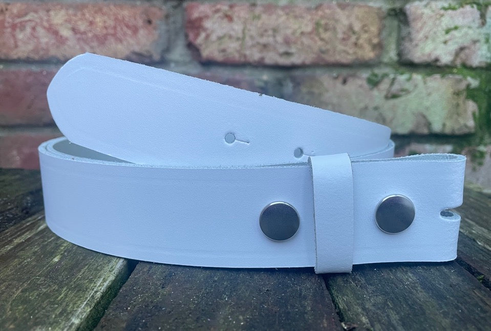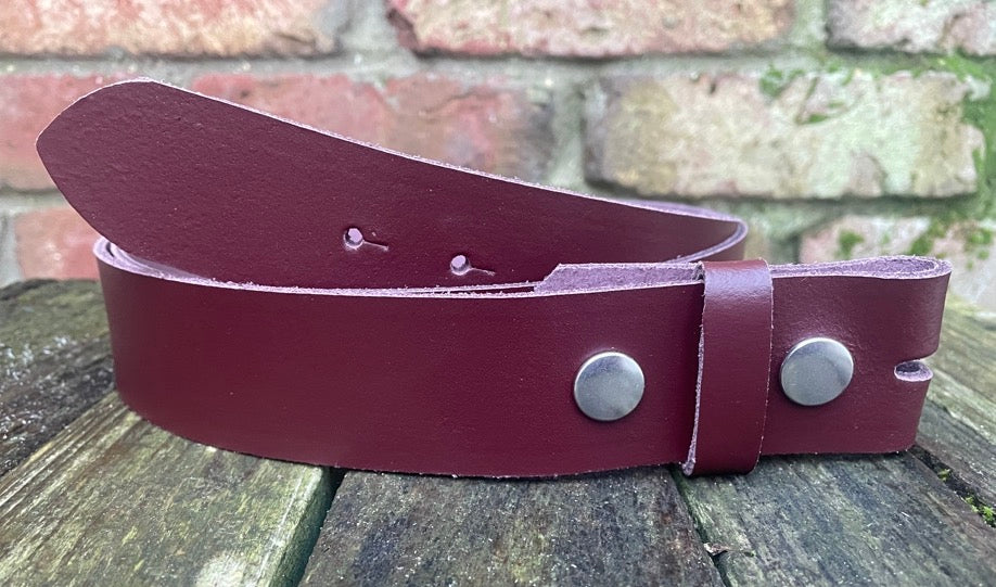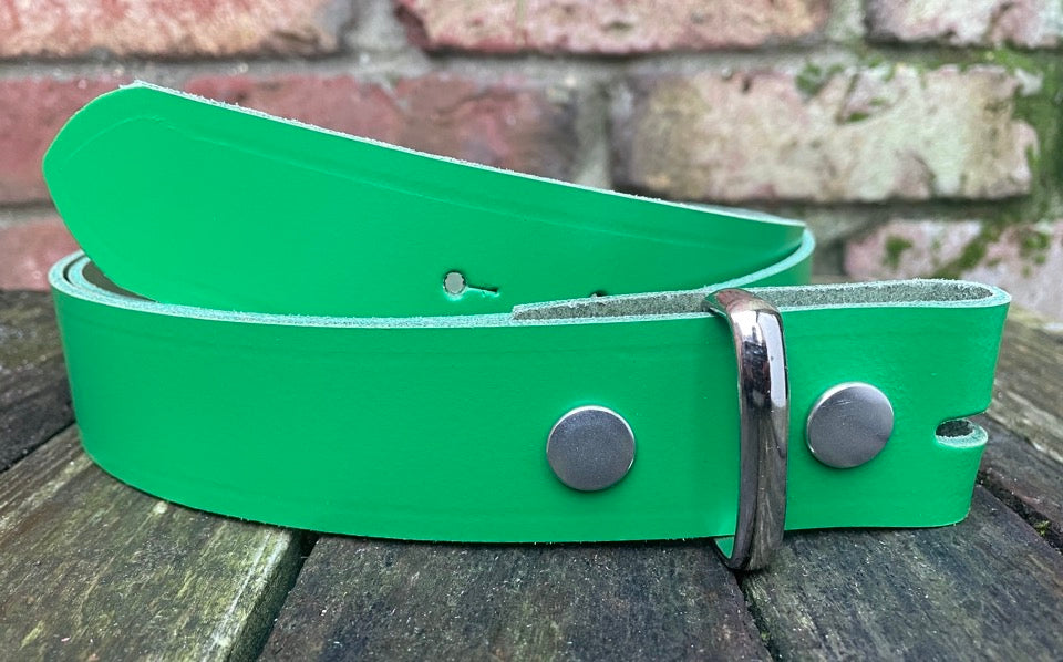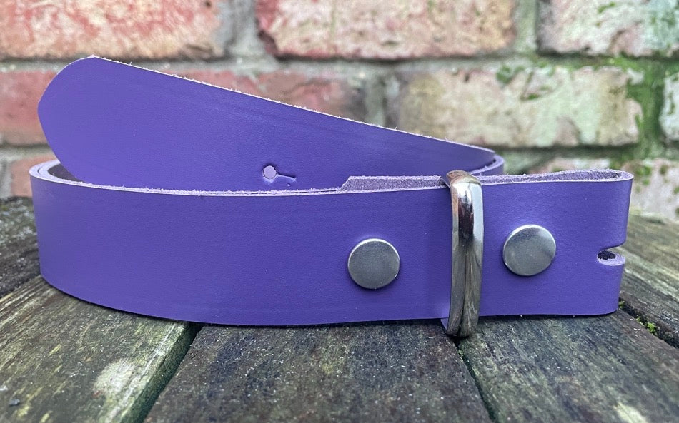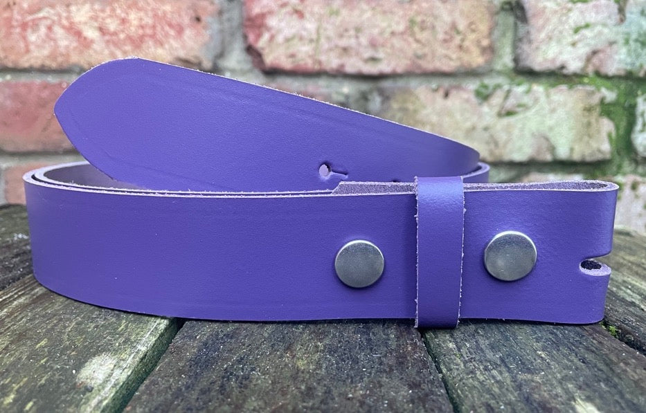Plain leather 19mm-50mm wide press stud/snap belt with nickle plated steel studs. Choice of 13 colours.