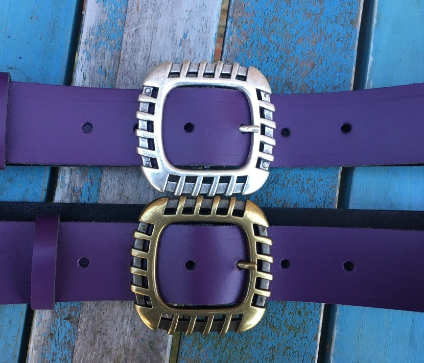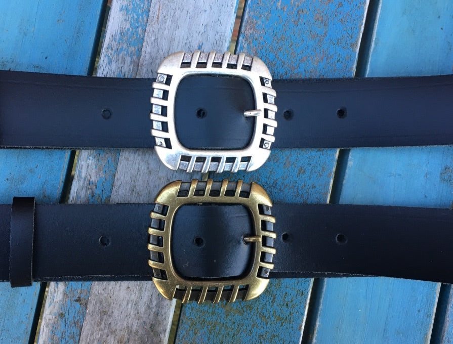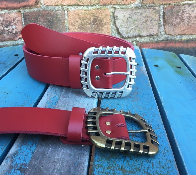 This belt is made from approx 3mm thick leather, measures approx 38mm (1 1/2 inch) wide and available in a choice of colours. This belt is fitted with either an old sliver or old brass 'Euro' buckle and comes with a loose leather keeper loop.