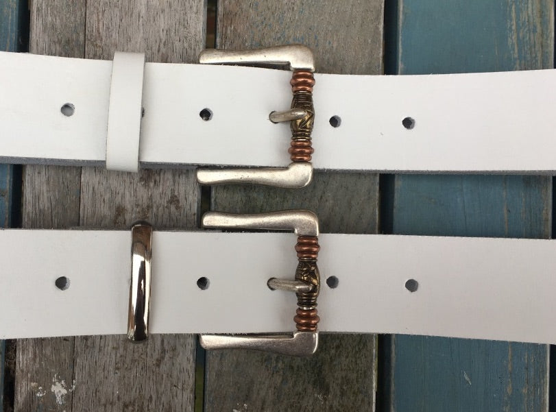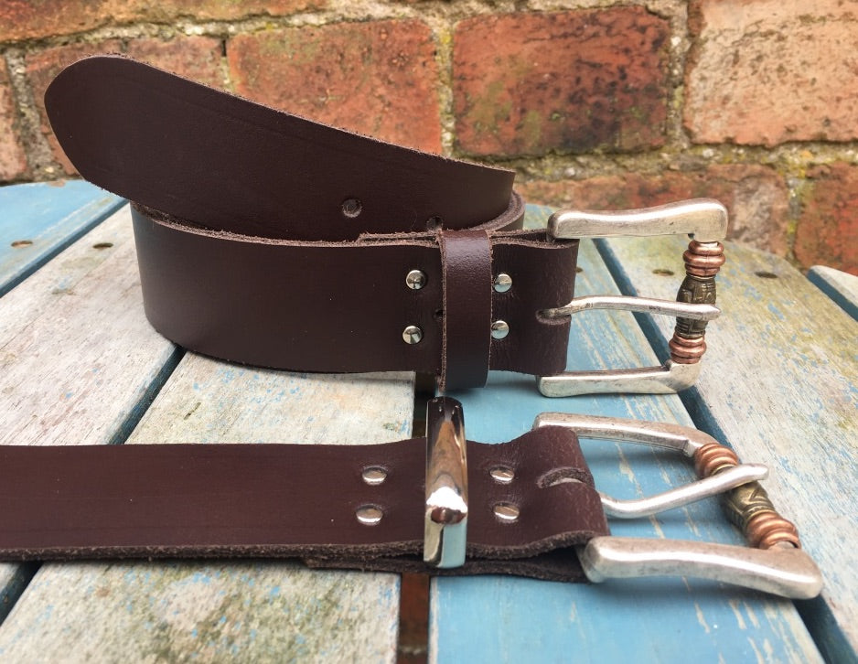 This belt is made from approx 3mm thick leather, measures approx 38mm (1 1/2 inch) wide and available in a choice of colours. The belt is fitted with a 'boho' buckle in old silver finish with metal beads on the roller and is available with either a leather or a nickel plated steel keeper loop.