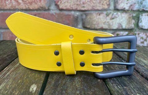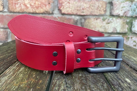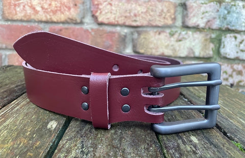 Measuring approx 1 1/2 inches (38mm) wide, fitted with a zinc dye cast double prong buckle in a brushed gunmetal finish and leather keeper loop. I finish these belts with a crease running along the edges, if you don't want this crease please let me know after purchase.