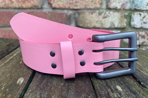 This belt is made from approx 2.4 - 2.6mm (black 2.8 - 3.0mm) thick leather cut from whole butt splits often shortened to leather splits and is a classic cut of the hide for basic belts.