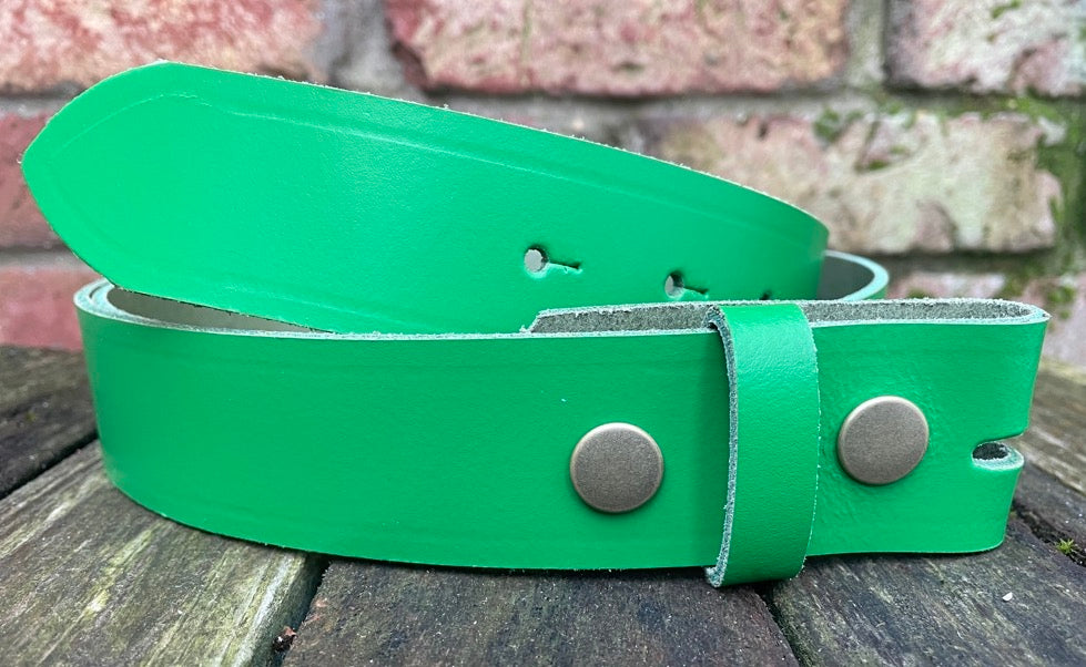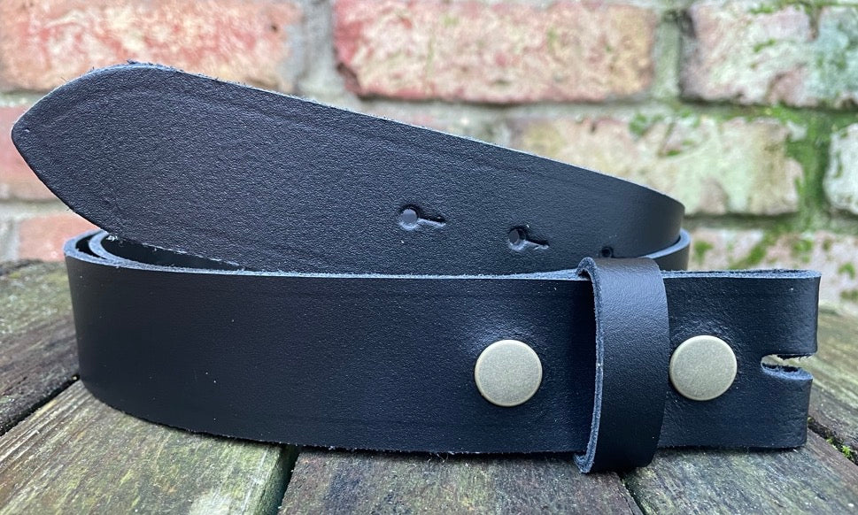 Plain leather 19mm-50mm wide press stud/snap belt with antique brass look steel studs. Choice of 13 colours.