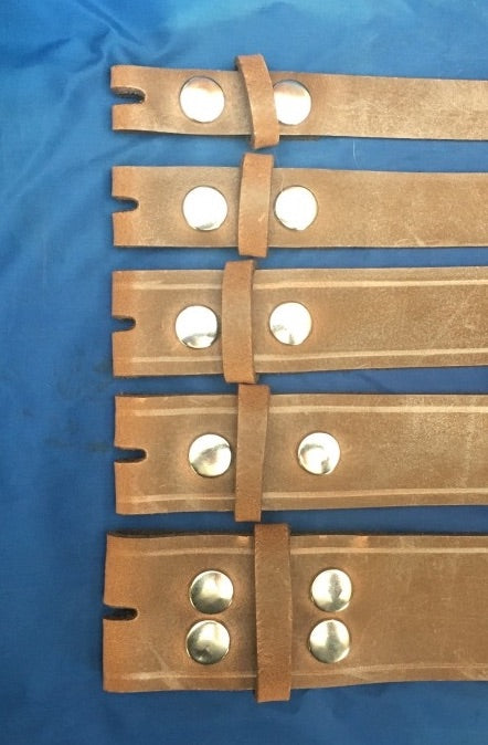 Fitted with antique brass look steel press studs / snaps, a leather keeper loop and available in a choice of 7 widths: