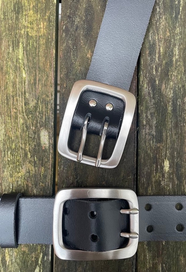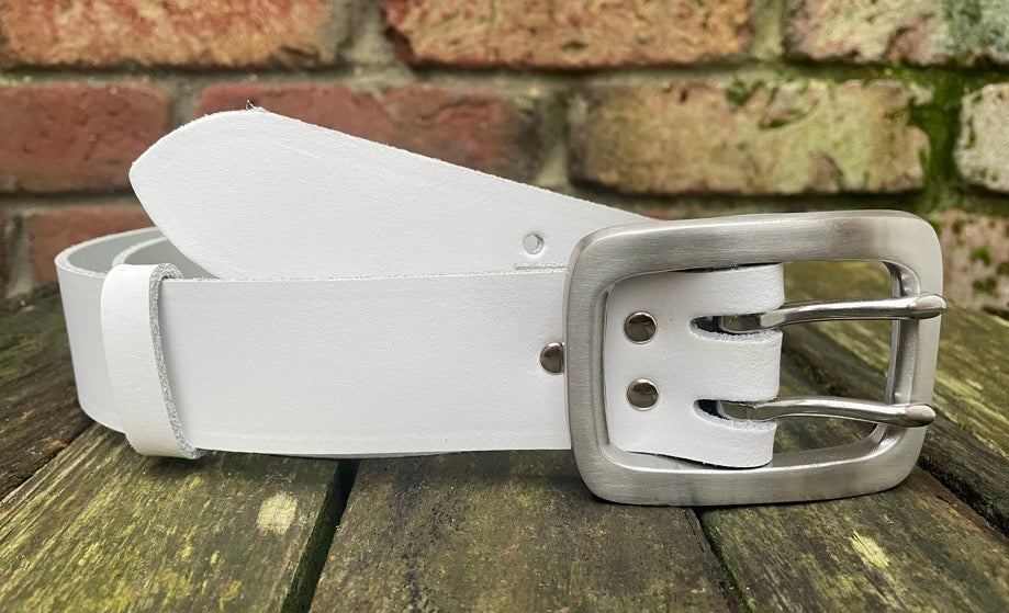 Plain leather 38mm wide belt with 2 prong stainless steel buckle. Choice of 13 colours