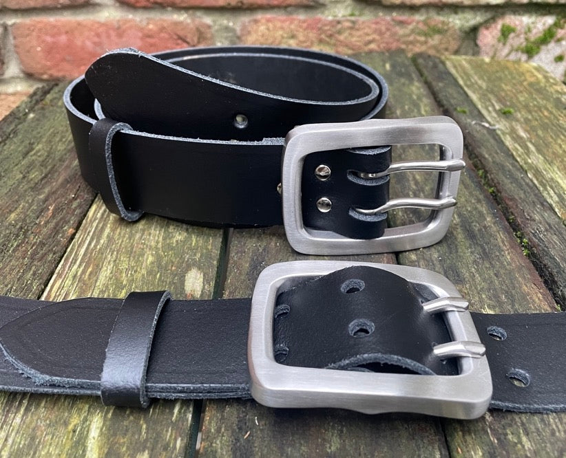 Measuring approx 1 1/2 inches (38mm) wide, fitted with a stainless steel (AISI 304) double prong buckle in a brushed finish and comes with a loose leather keeper loop. I finish these belts with a crease running along the edges, if you don't want this crease please let me know after purchase.