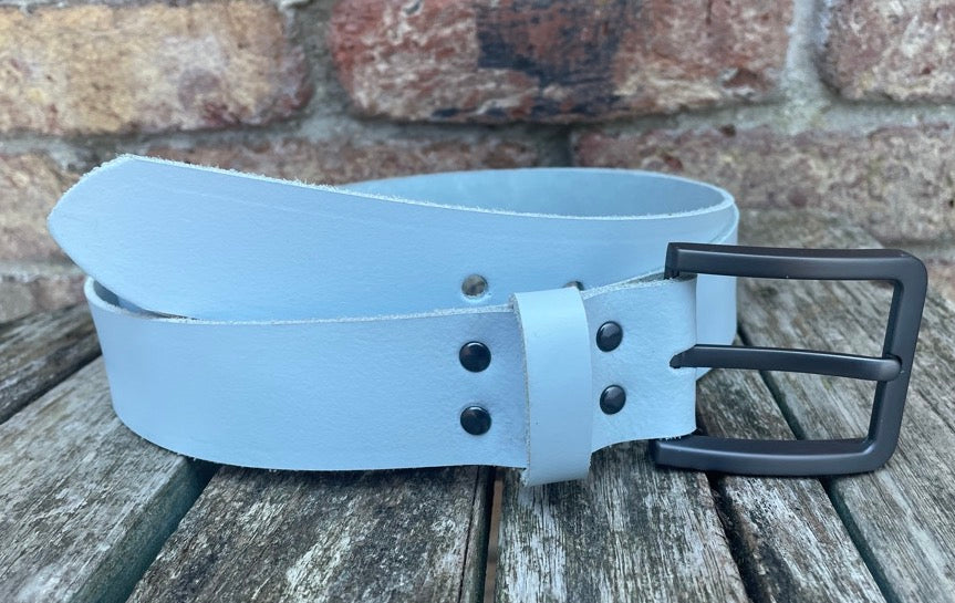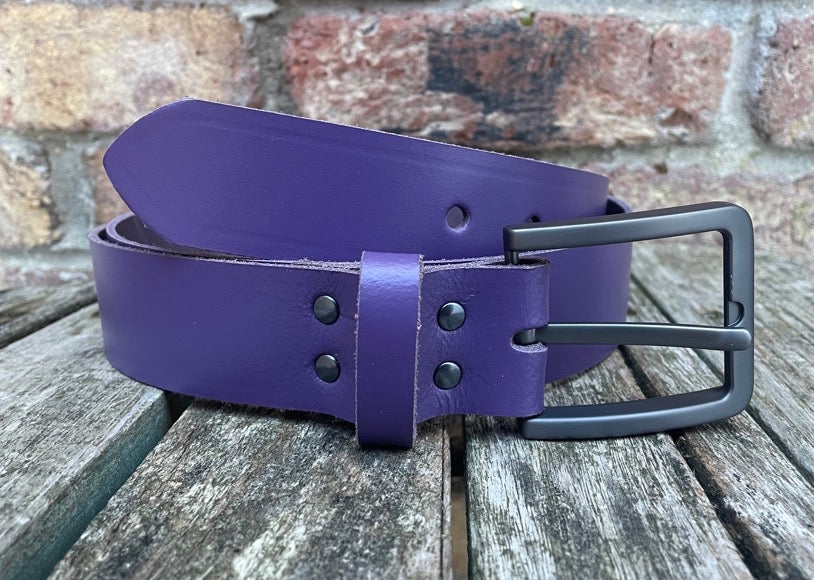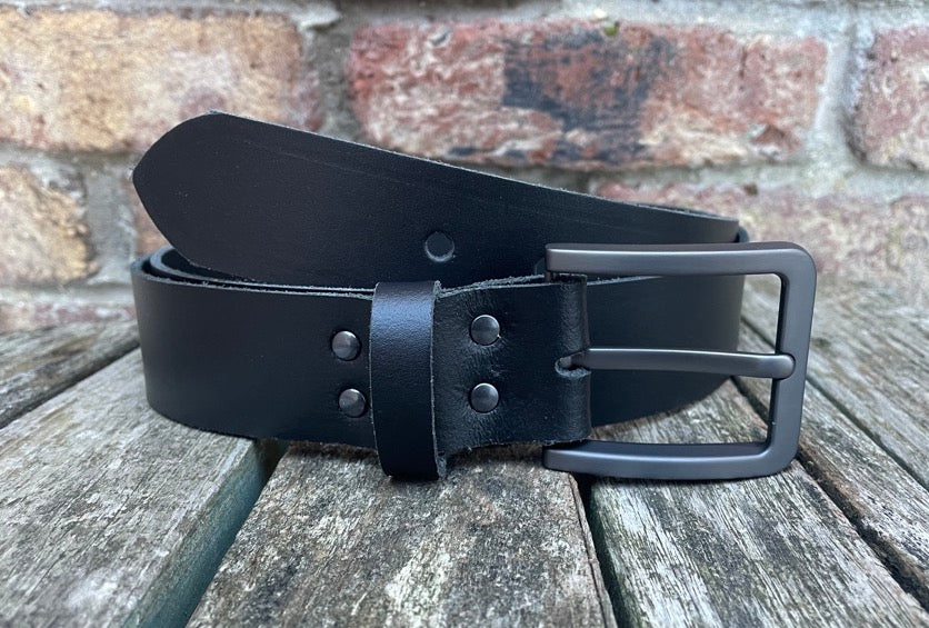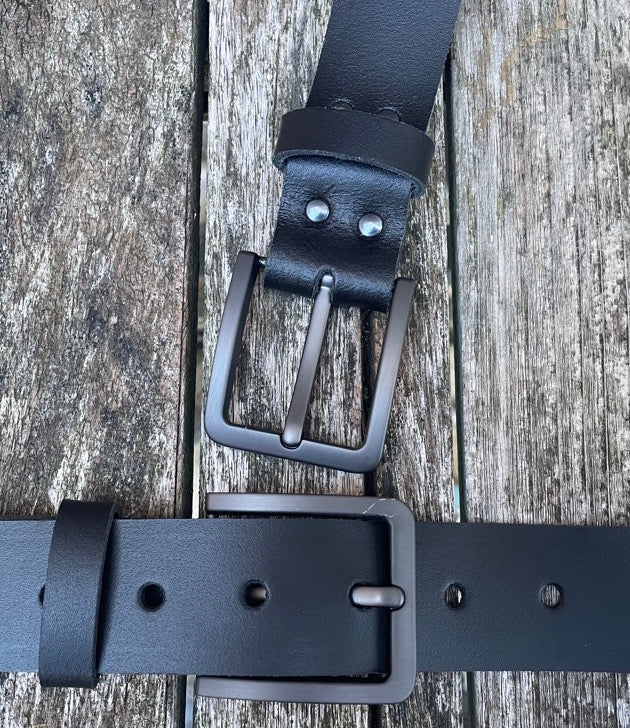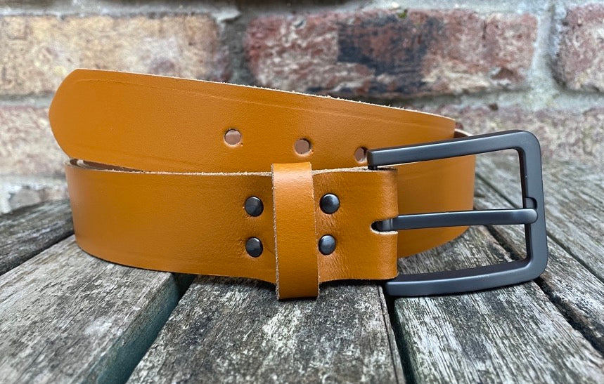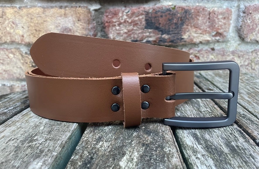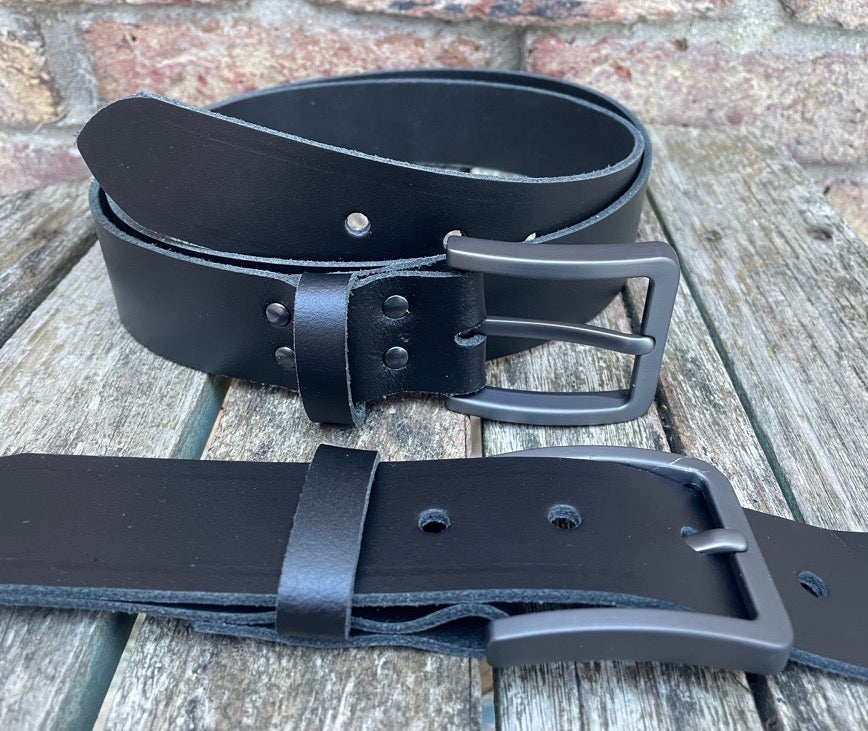 Measuring approx 1 1/2 inches (38mm) wide, fitted with a brushed gunmetal zinc die cast buckle and leather keeper loop. I finish these belts with a crease running along the edges, if you don't want this crease please let me know after purchase.