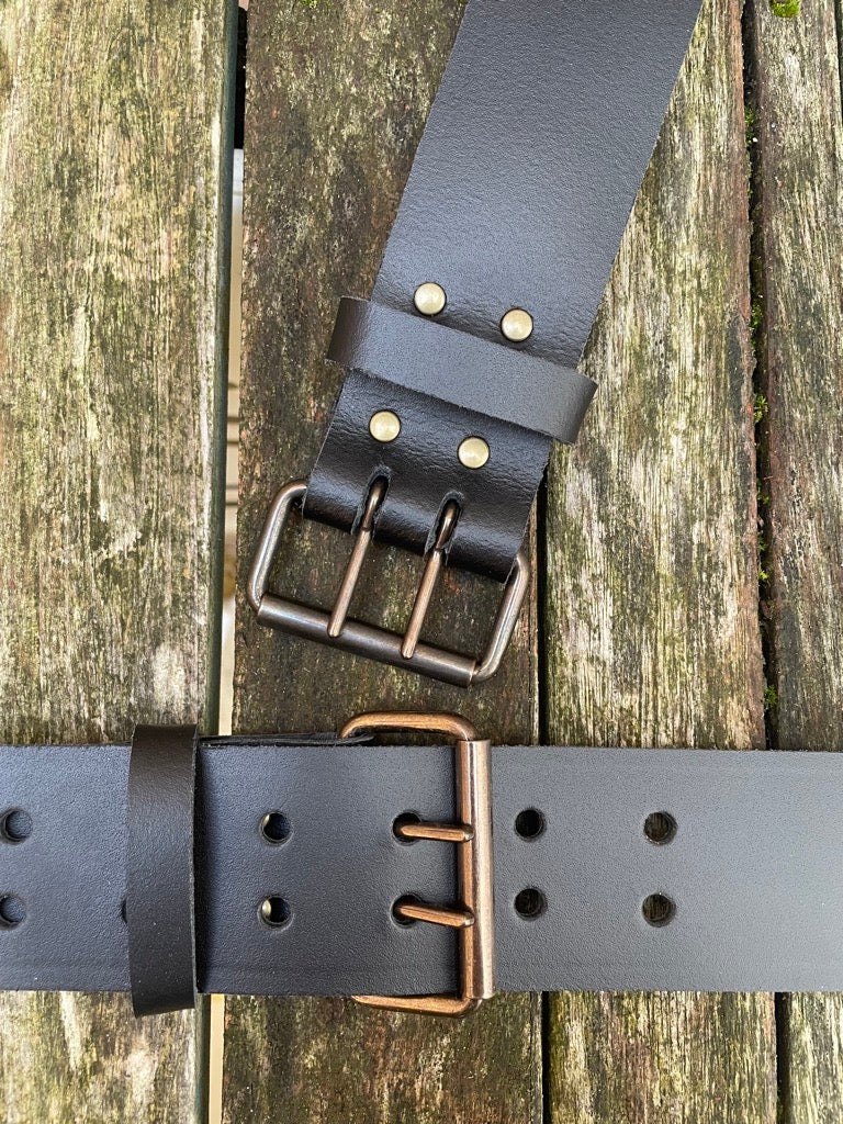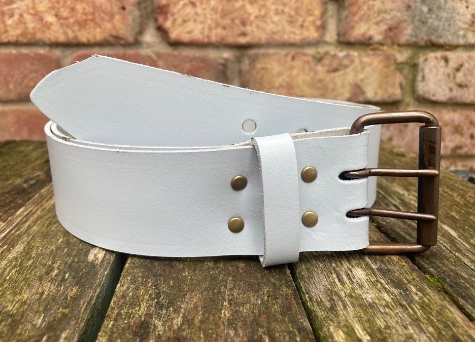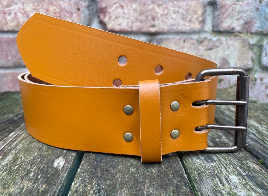 Plain leather 50mm wide belt with 2 prong dark brass look steel roller buckle. Choice of 13 colours