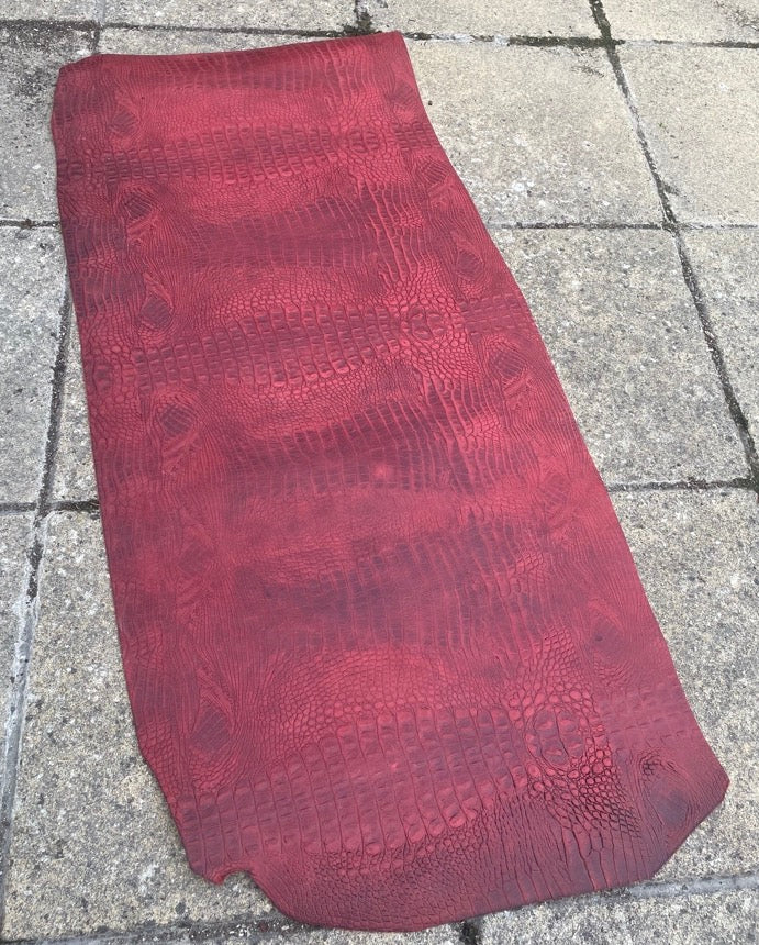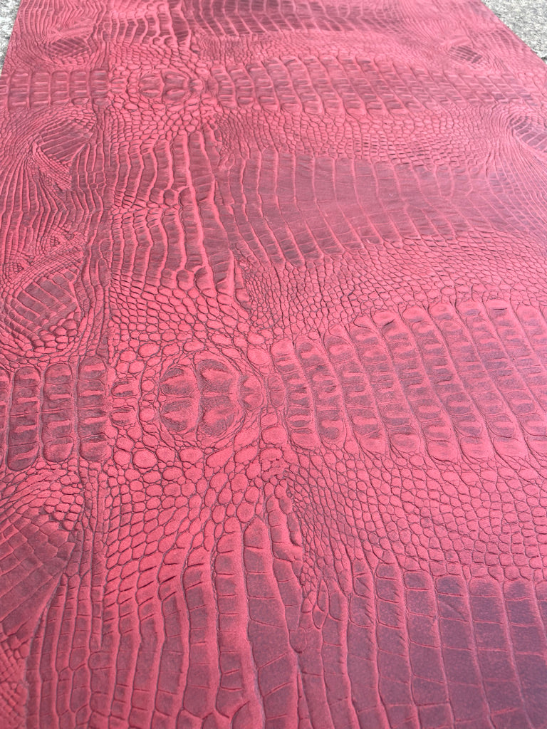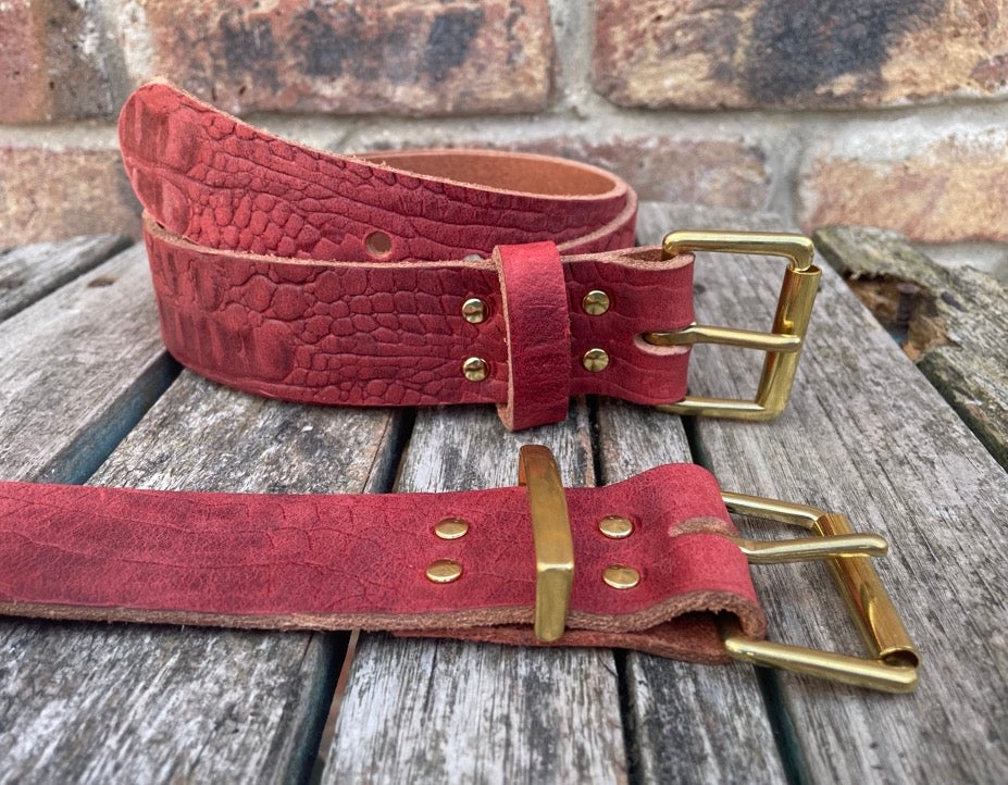Red crocodile skin look buffalo leather belt & solid brass roller buckle. Choice of width