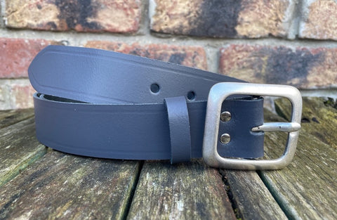 Measuring 1 1/2 inches (38mm) wide, fitted with a pewter rectangle buckle and comes with a loose leather keeper loop. I finish these belts with a crease running along the edges, if you don't want this crease please let me know after purchase.