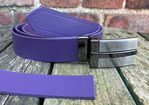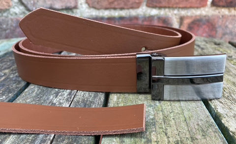 This belt measures approx 30mm wide and is made from approx 2.4-2.6mm (black 2.8-3mm) thick leather cut from whole butt splits often shortened to leather splits and is a classic cut of the hide for basic belts.