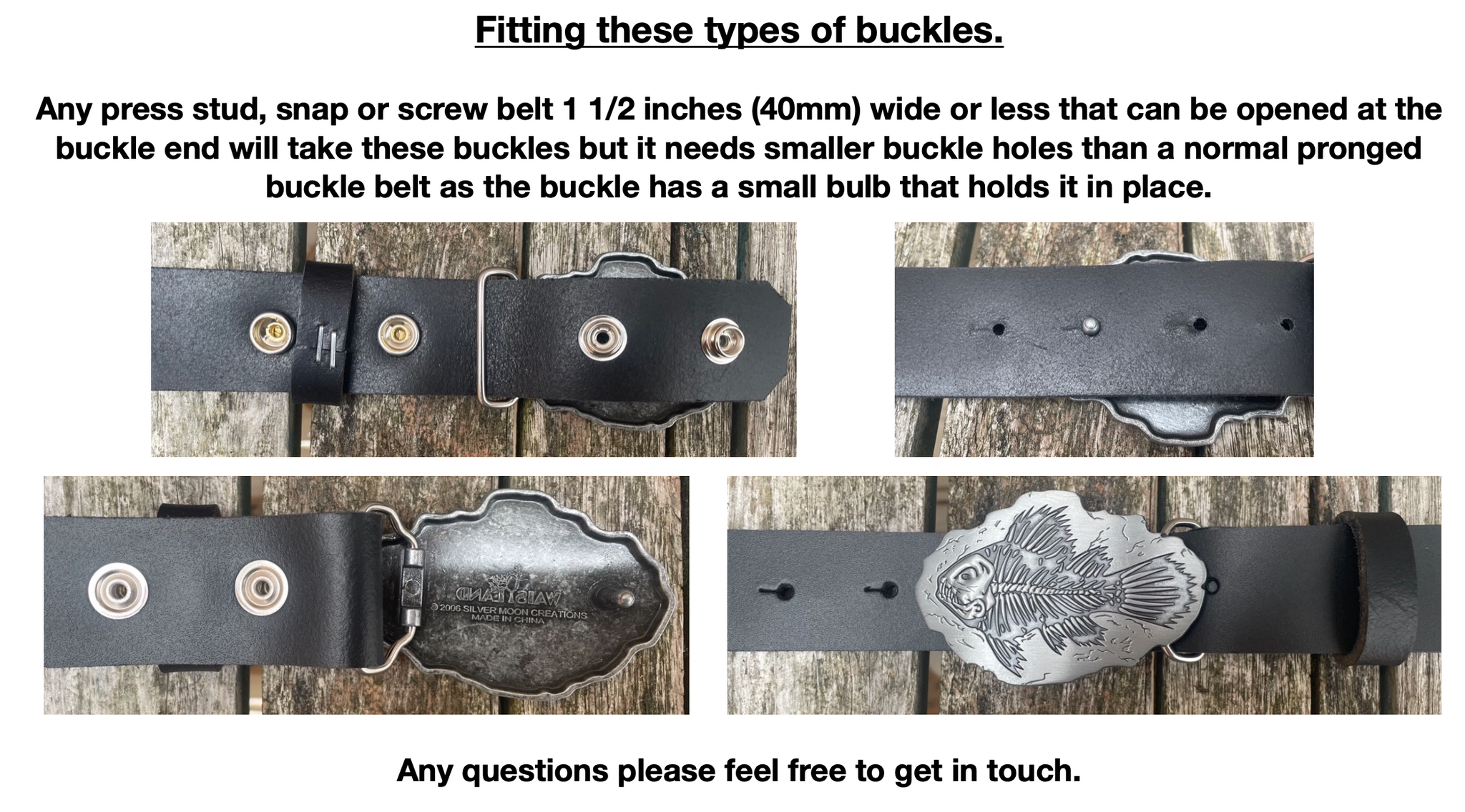 Made from zinc alloy this belt buckle will fit any press stud, snap or screw belt up to 40mm (1 1/2 inches) wide with the right buckle holes, see picture. Press stud, snap belts can be seen here.