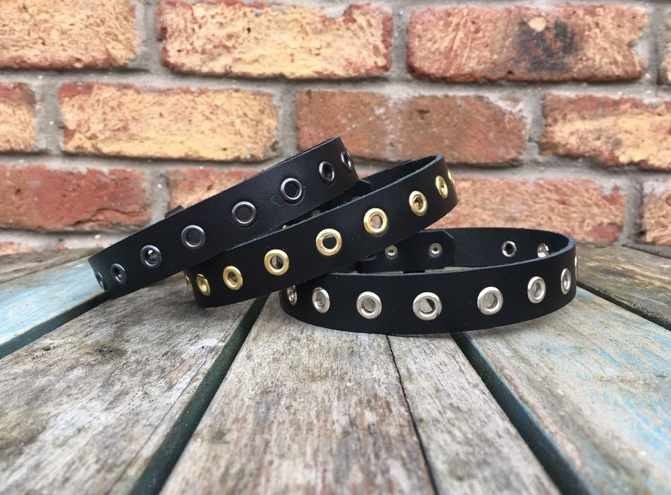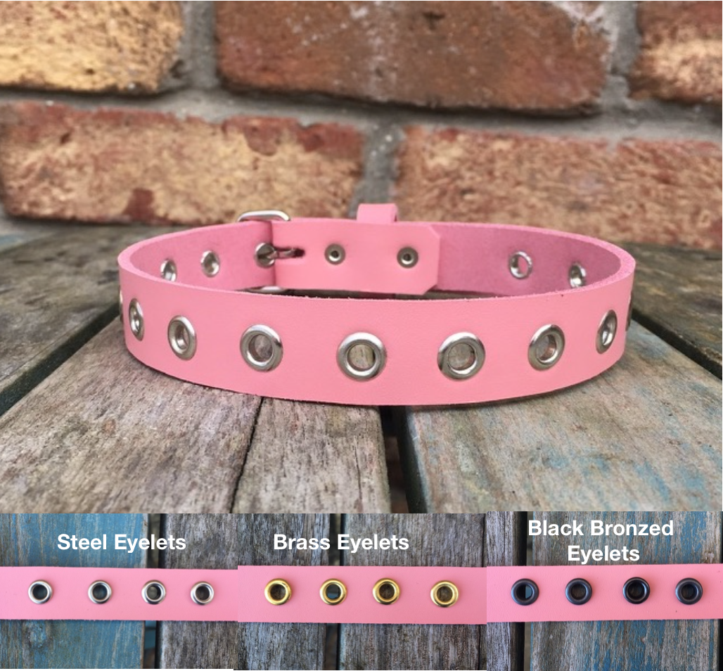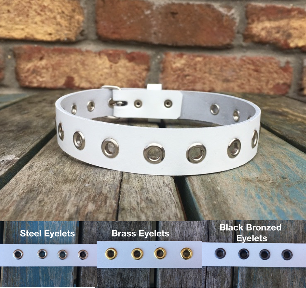 This choker is made from approx 3mm thick leather in a choice of colours and with a choice of Steel, Brass or Black Bronzed eyelets.