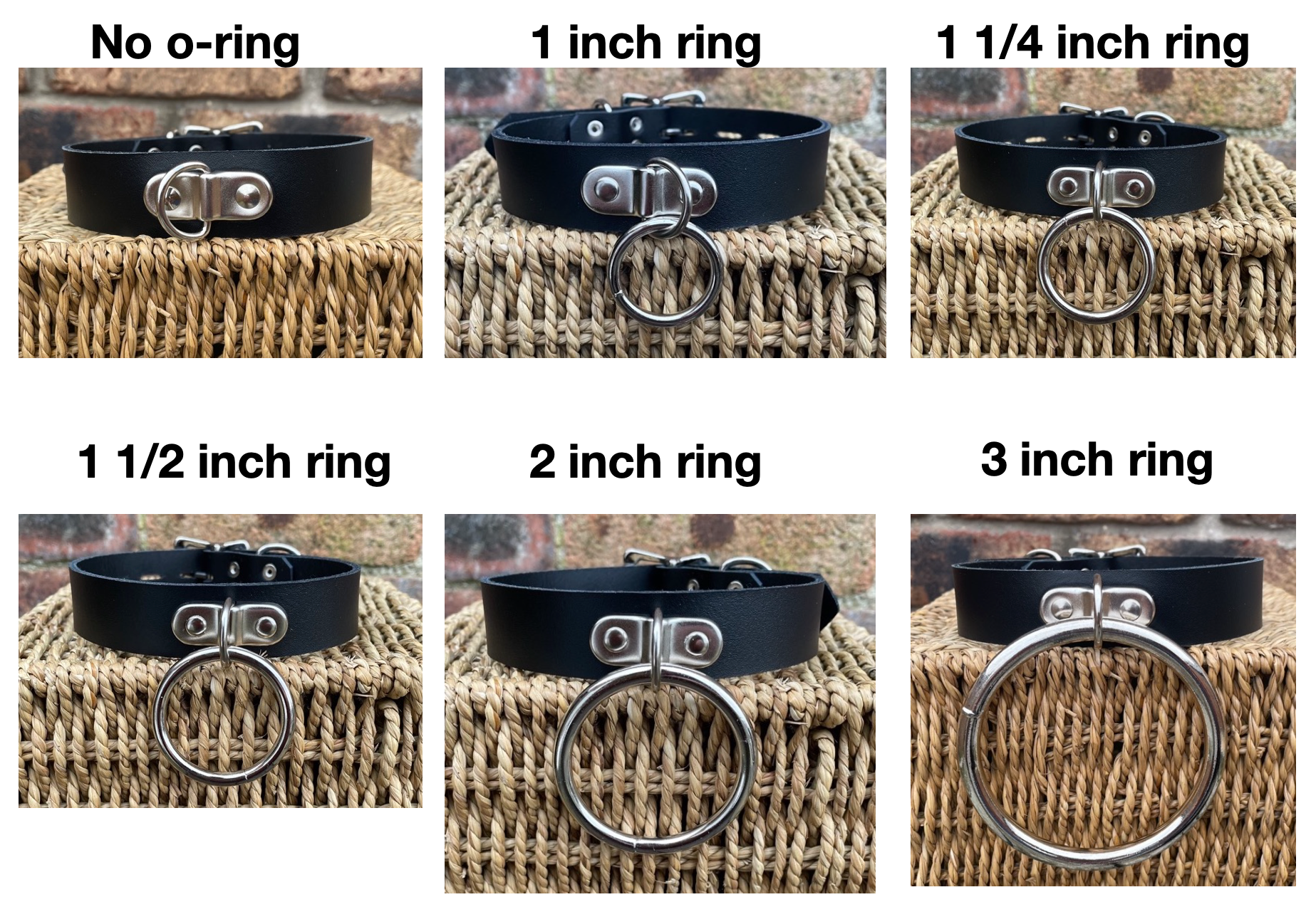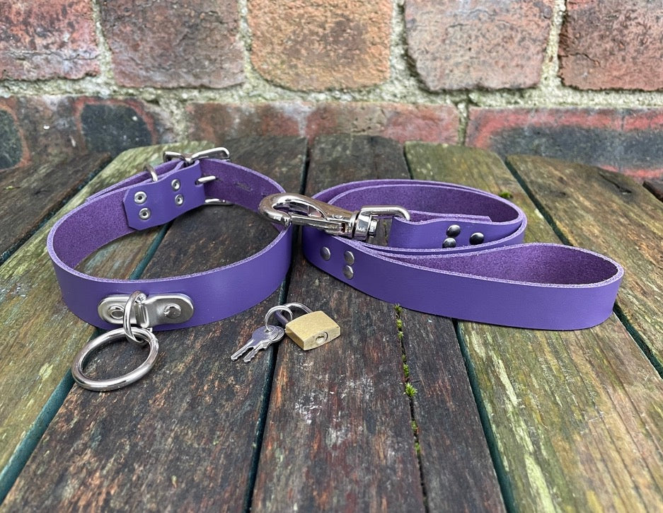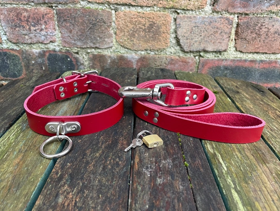 This choker is made from approx 3mm thick leather in a choice of colours and fitted with a nickel plated steel o-ring hanging from a D-ring plate in the middle. The o-ring is available in a choice of five sizes.