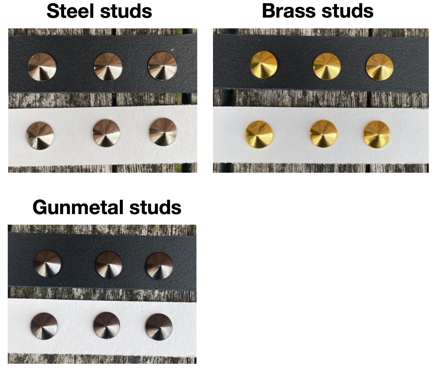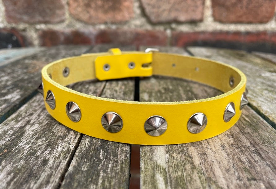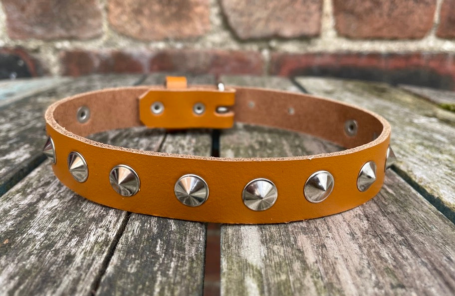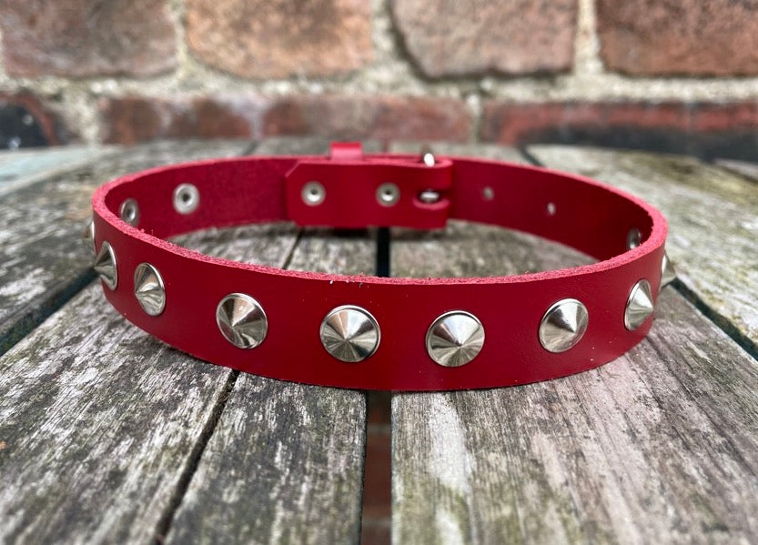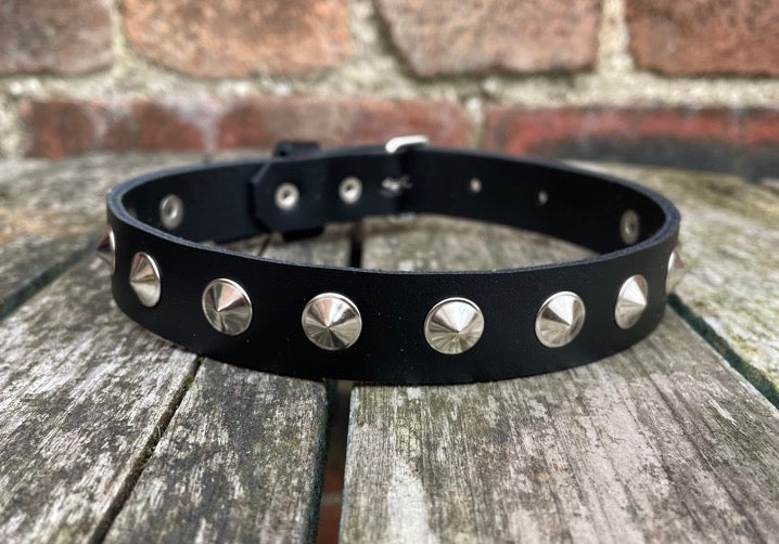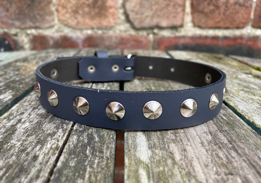 This choker is made from approx 3mm thick leather in a choice of colours and with a choice of Steel, Brass or Gunmetal round conical studs.
