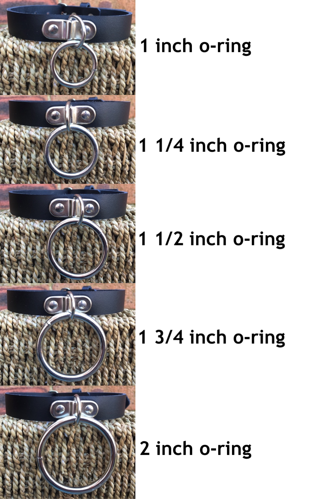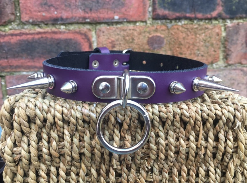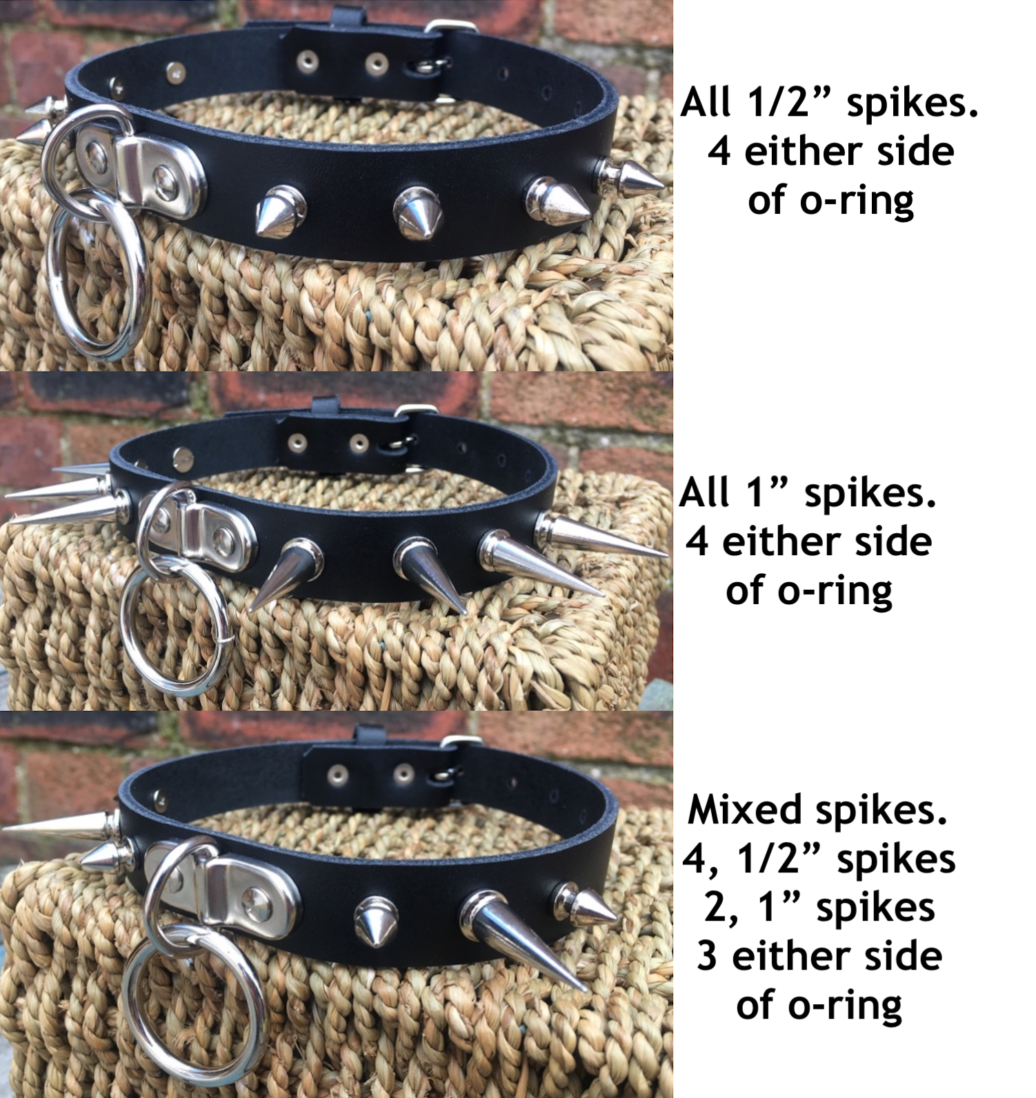This choker is made from approx 3mm thick leather in a choice of colours and fitted with a nickel plated steel o-ring hanging from a D-ring plate in the middle and a choice of nickel plated steel spikes either side of it. The o-ring is available in a choice of five sizes.
