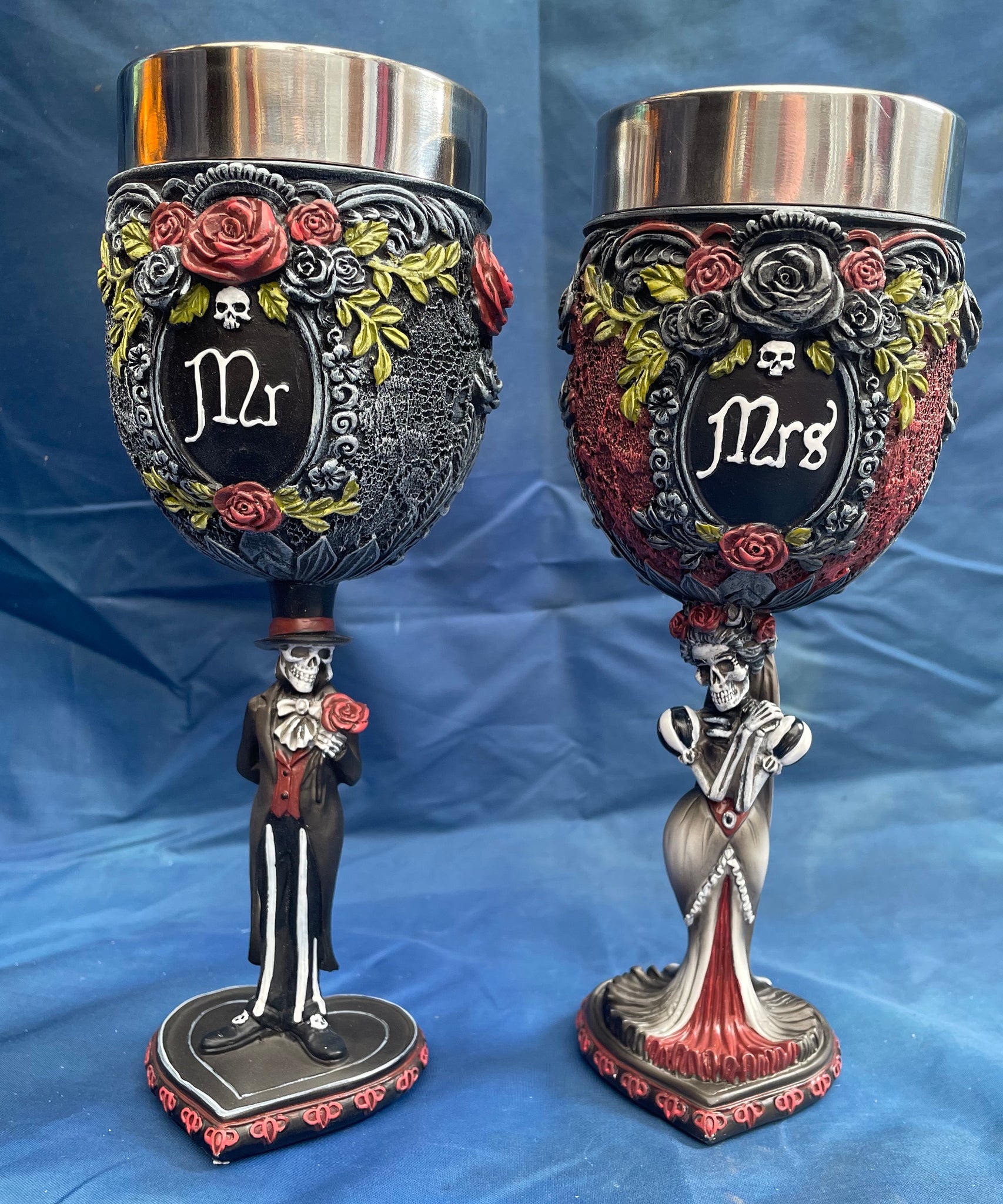Mr & Mrs skeleton goblets from Nemesis Now. Made from resin and painted. Each goblet has a metal inner drinking part that can be removed for washing, do not wash the goblet itself as the resin could chip and mark with scouring pads and such.