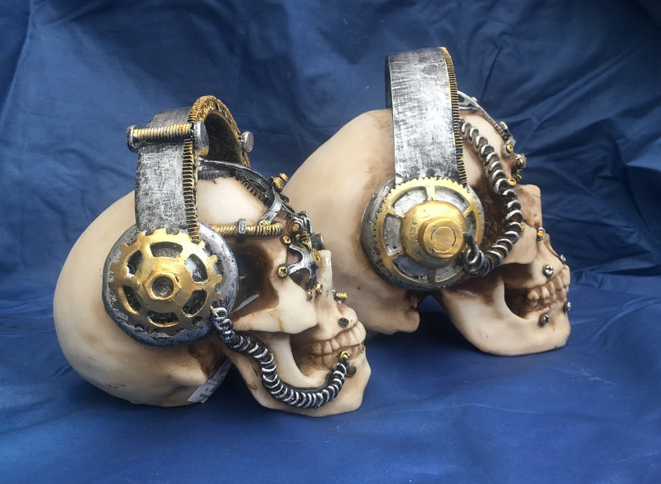 Steampunk techno talk skull ornament from Nemesis Now. Made from resin and finished to give a bone like effect with some mechanical detail. The headphones are fixed to the skull so can't be lifted off.