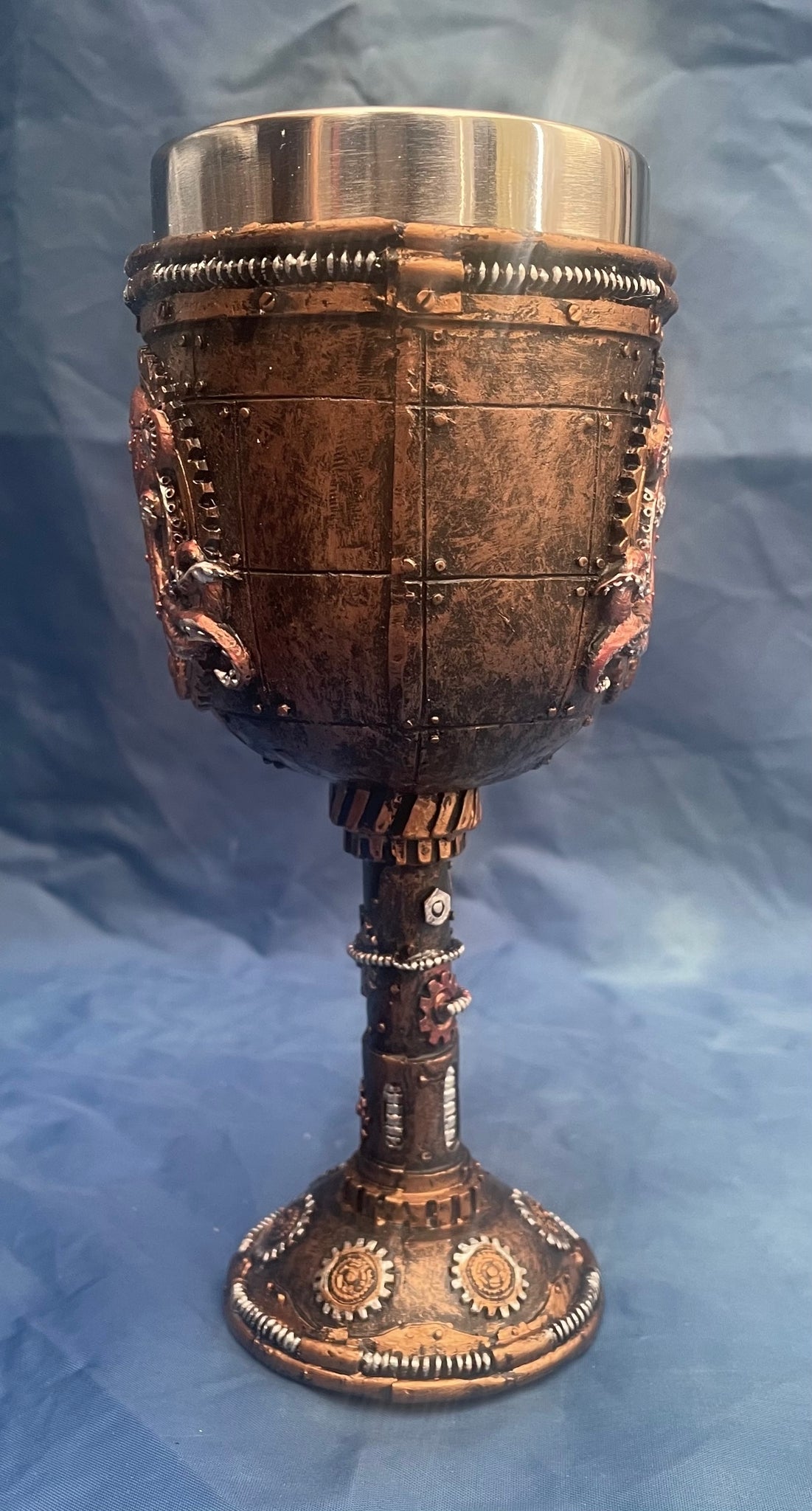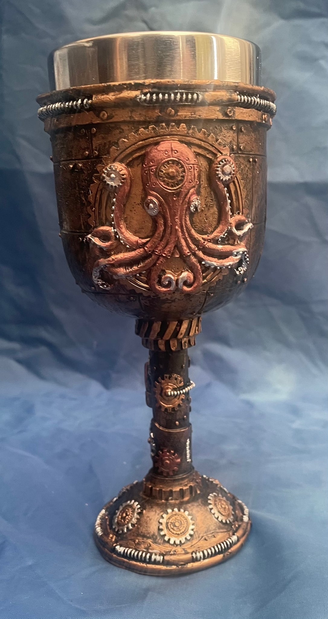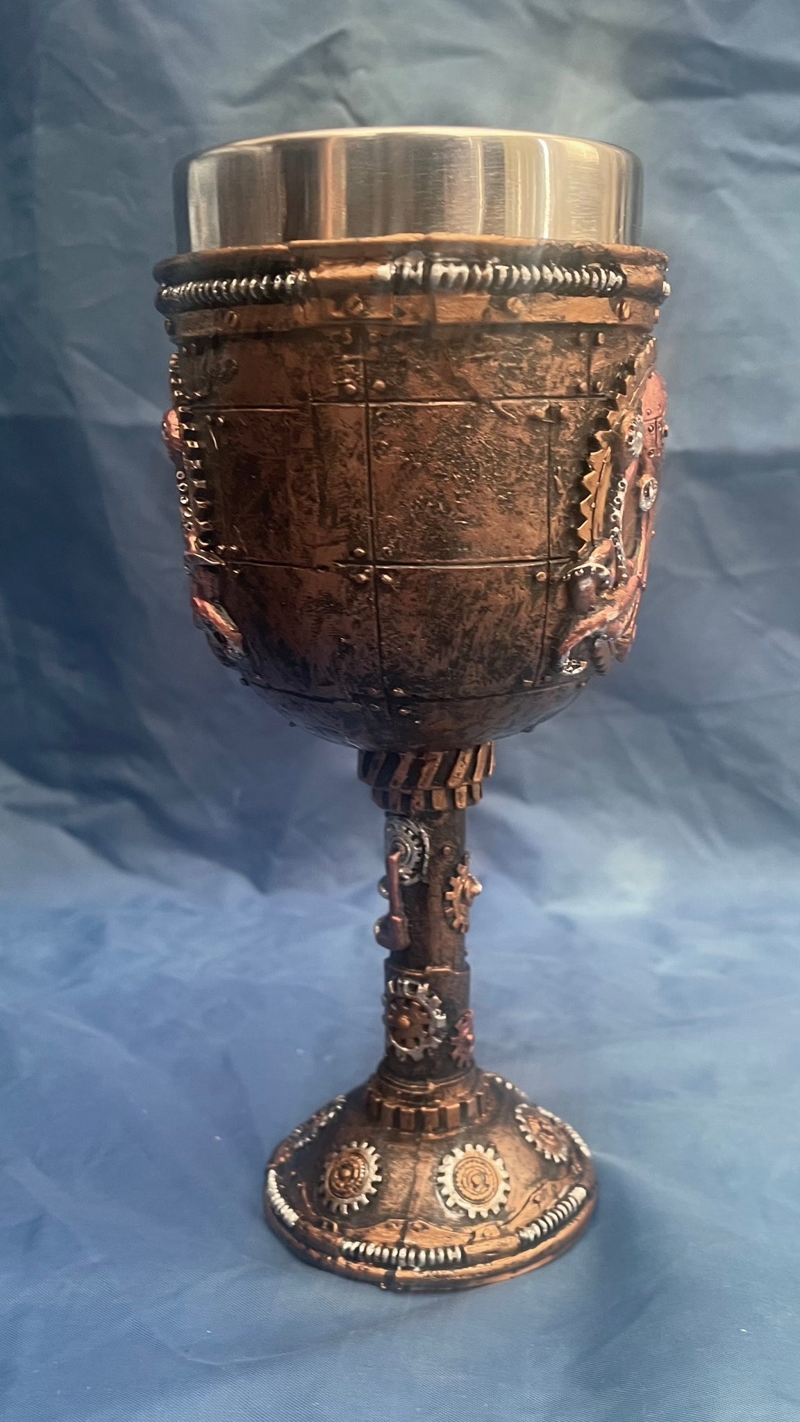 Kraken goblet, made from resin with a metal inner cup that can be removed for washing, do not wash the goblet itself as the resin could chip and mark with scouring pads and such.