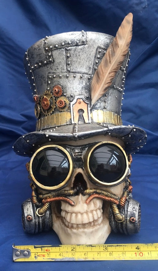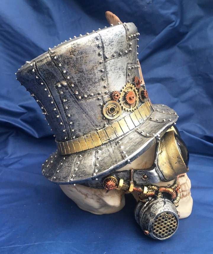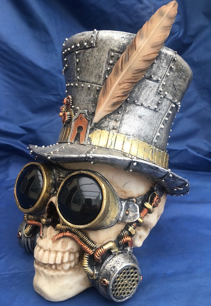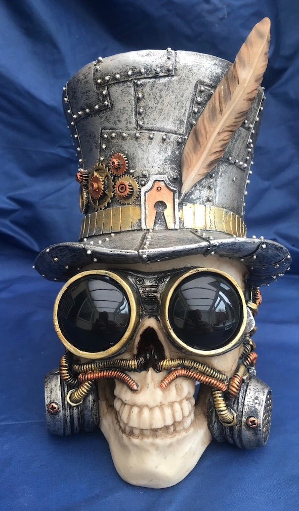 Steampunk count Archibald skull ornament from Nemesis Now. Made from resin and finished to give a bone like effect with some mechanical detail.