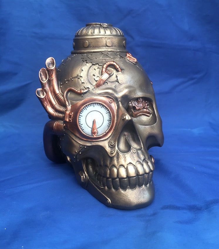 Steampunk pipe up skull figurine from Nemesis Now. Made from solid resin and finished to give a bronze like effect with some brass detail the weight of this figurine is approx 880g.